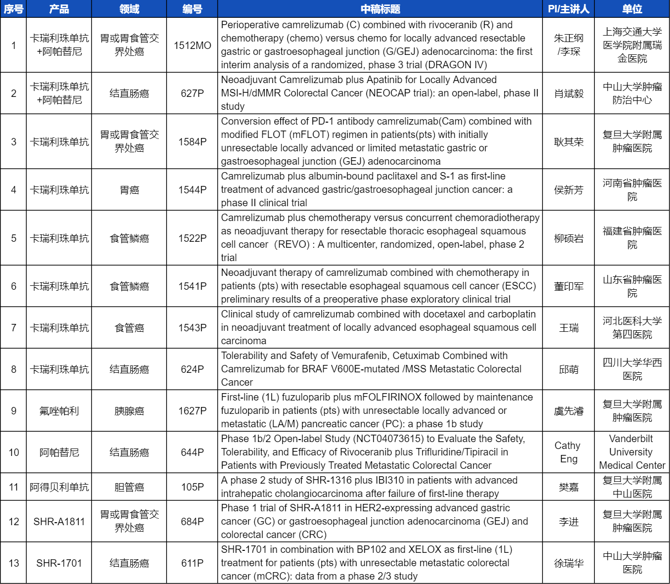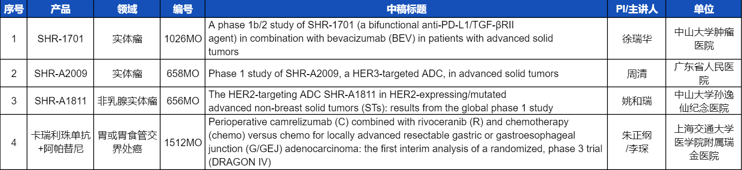 本次ESMO大会,将由中山大学肿瘤医院徐瑞华教授、广东省人民医院周清教授、中山大学孙逸仙纪念医院姚和瑞教授、上海交通大学医学院附属瑞金医院李琛教授分别就4项918博天堂医药创新产品相关研究做口头报告,包括SHR-1701、SHR-A2009、SHR-A1811这3款未上市创新产品的实体瘤治疗临床研究,以及1项“双艾”组合(卡瑞利珠单抗联合阿帕替尼)治疗局部晚期可切除胃/胃食管交界处癌的Ⅲ期临床试验期中分析。